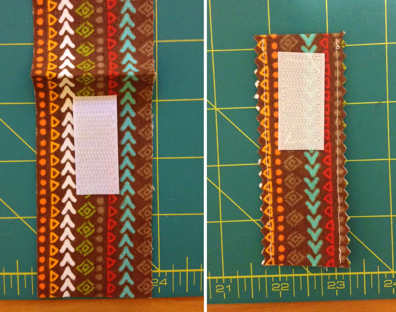 [2] Next, take your 2"x8" accent piece and fold it in half (wrong sides together). Place your velcro right under the crease, unfold your fabric & stitch it into place. Once secured, fold your fabric again (wrong sides together) and stitch down both sides to form the tab. Using your pinking sheers, trim both edges so they don't fray.